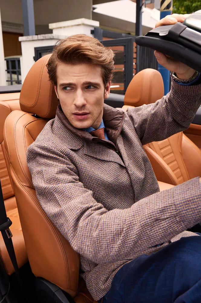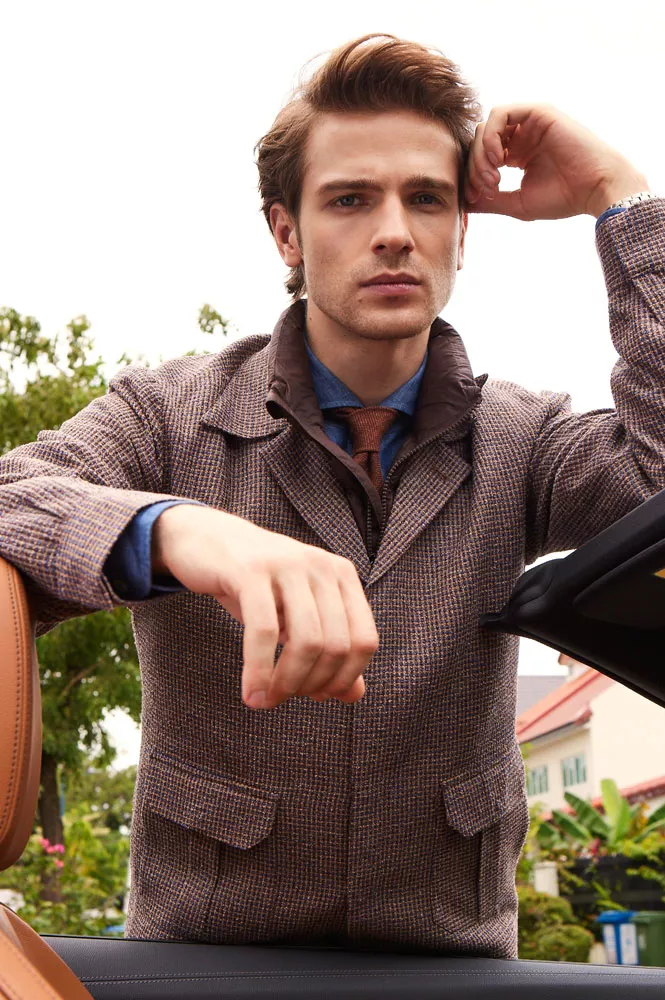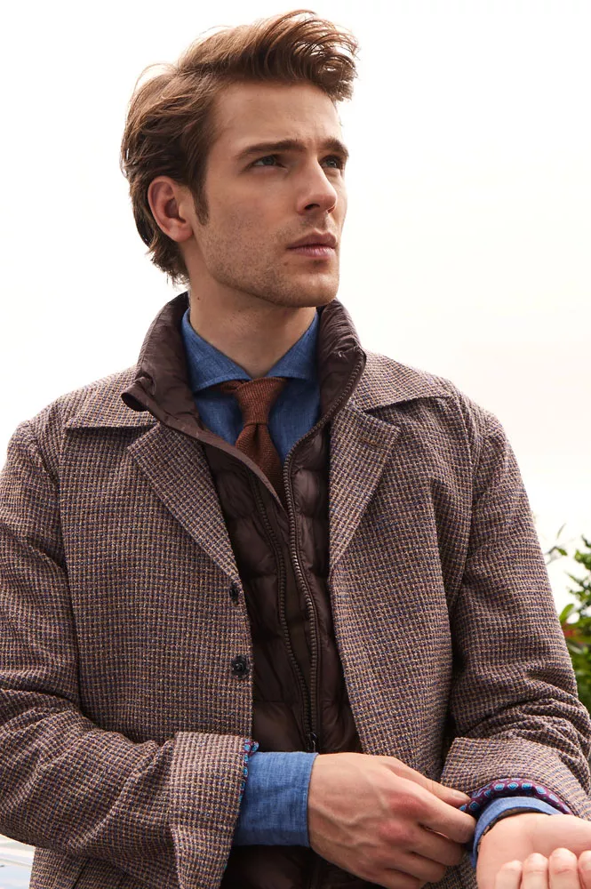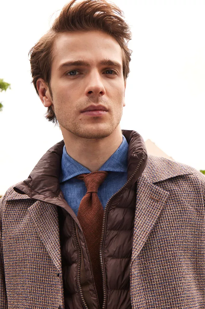 The tonal brown microcheck is excellent style camouflage. Pick a shirt or polo tee with a striking colour that makes a statement. Consider extra layering to create depth and dynamism to your look.